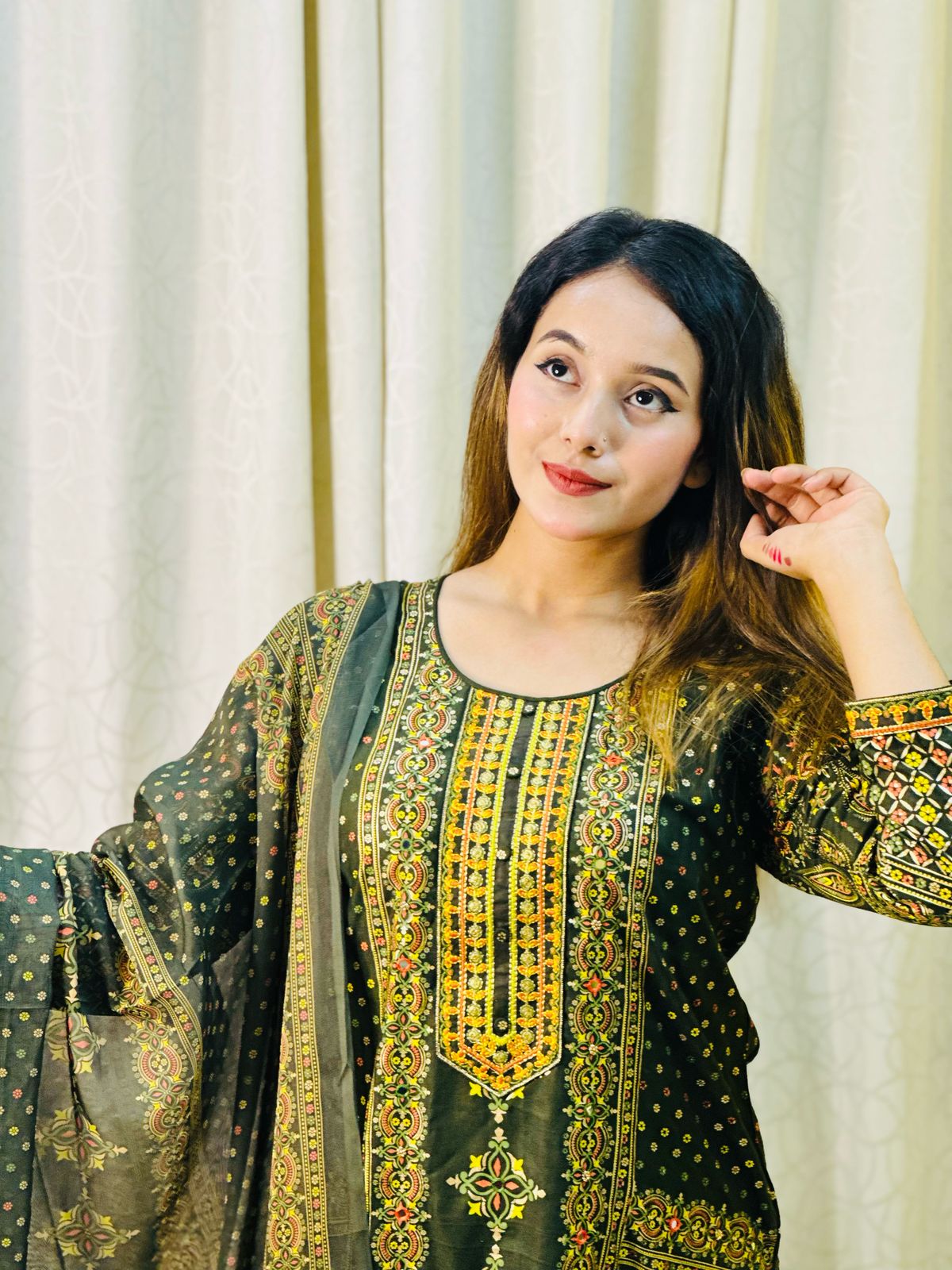 ফেব্রিকঃ অরজিনাল সফটওয়্যার কাশ্মীরি চিনিগুড়া ফেব্রিক্স স্কিন প্রিন্ট এমব্রয়ডারি & কারচুপির কাজ করা I