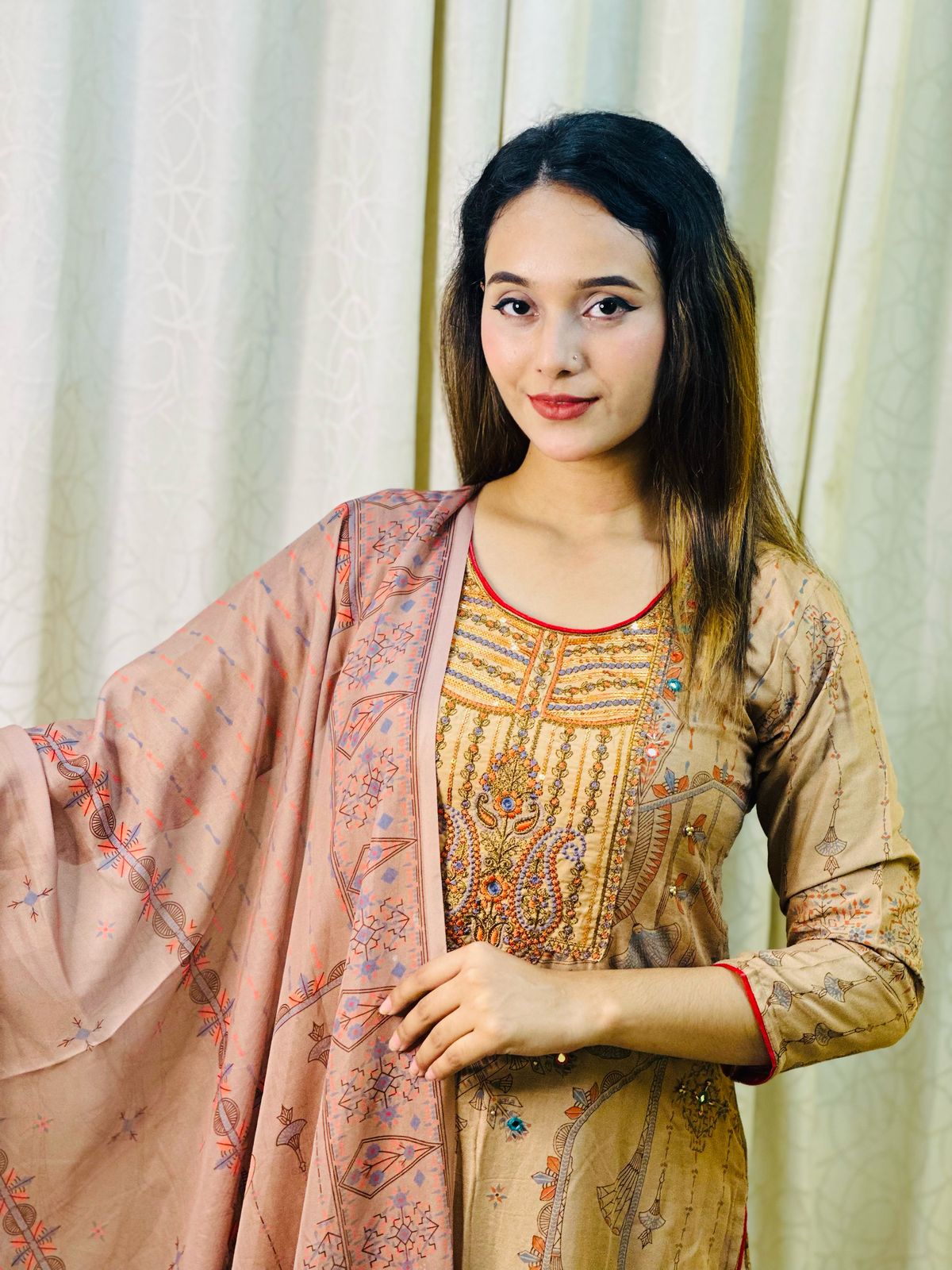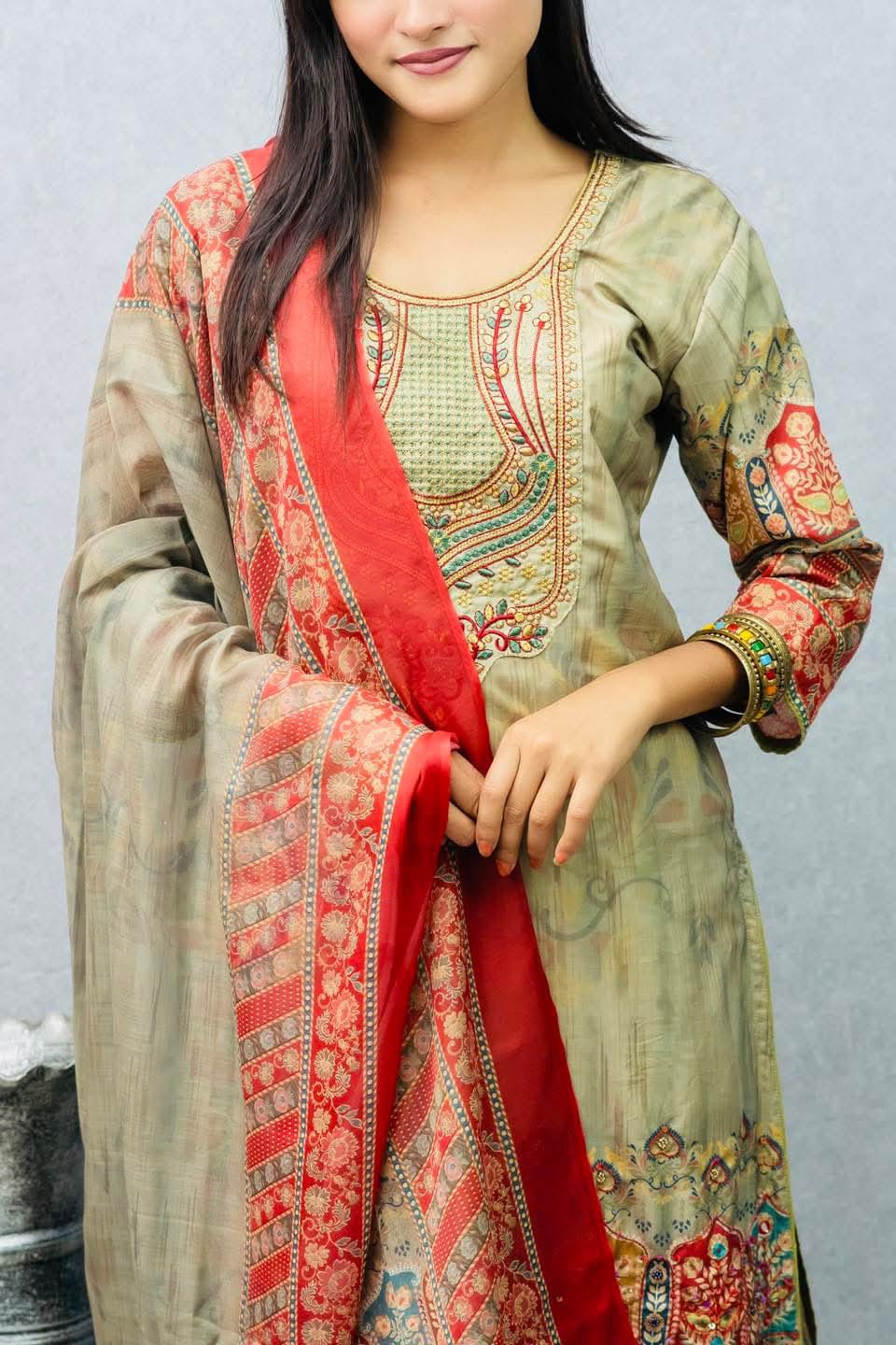ফেব্রিকঃ অরজিনাল সফটওয়্যার কাশ্মীরি চিনিগুড়া ফেব্রিক্স স্কিন প্রিন্ট এমব্রয়ডারি & কারচুপির কাজ করা I